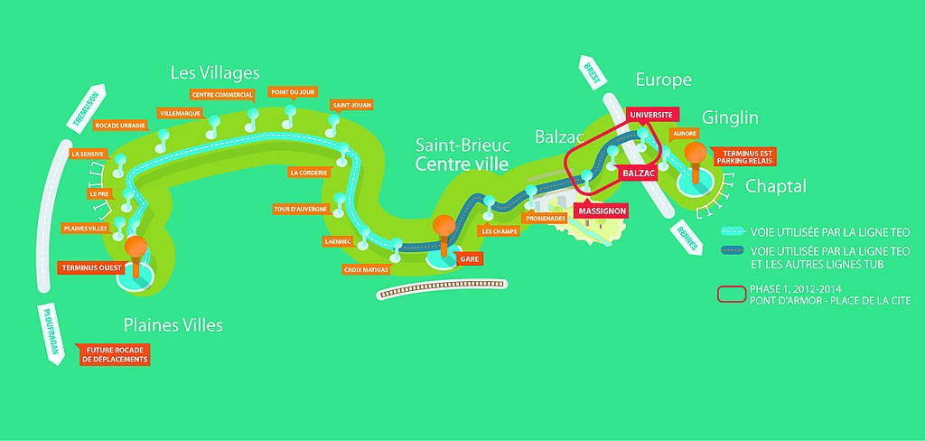 Le Transport Est Ouest (TEO) est un projet de l’agglomération briochine visant à améliorer le temps de parcours et la régularité des bus en aménageant des voies réservées au bus sur un axe traversant d’est en ouest l’agglomération. Une première tranche est en cours de finalisation entre la Place de la Cité et le pont d’Armor à St Brieuc.