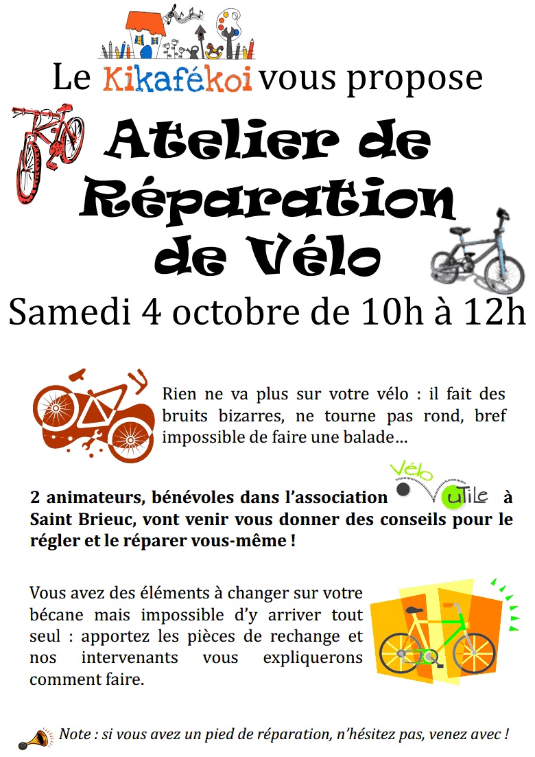 Venez expliquer votre problème samedi 4 octobre entre 10h et 12h au Kikafékoi : 2 animateurs, bénévoles dans l’association Vélo Utile à Saint Brieuc, vous donneront des conseils pour le régler et le réparer vous-même !!Vous devez changer des pièces mais impossible d’y arriver tout seul : apporter les éléments de rechange et les intervenants vous guideront.PS : il y aura déjà un pied de réparation sur place mais si vous en avez un en plus, n’hésitez pas, venez avec