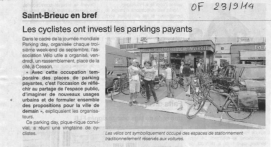 Merci à Jacky qui nous fait suivre un premier article relatif au happening « parking-day » et un second sur les nouveaux « sas vélo ».