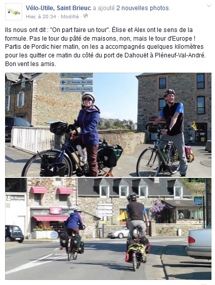 Élise et Alex ont le sens de la formule. Pas le tour du pâté de maisons, non, mais le tour d’Europe !Partis de Pordic hier matin, on les a accompagnés quelques kilomètres pour les quitter ce matin du côté du port de Dahouët à Pléneuf-Val-André.