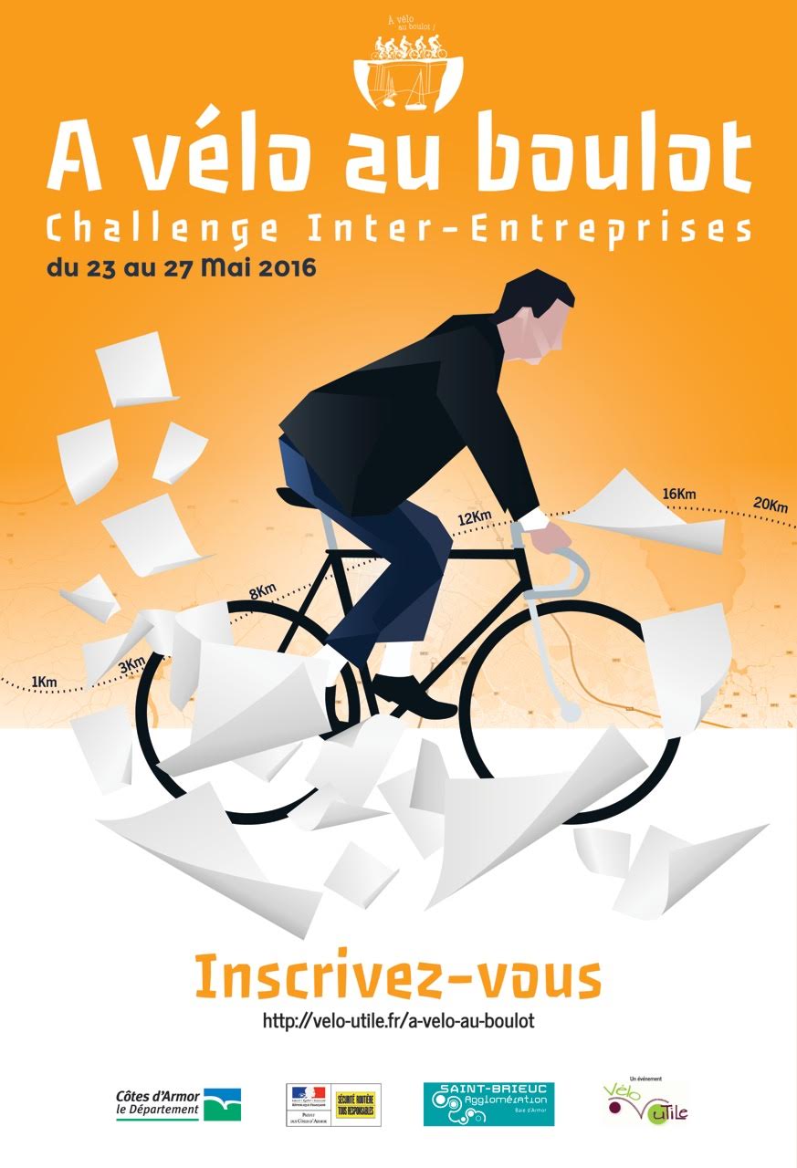 L’association Vélo Utile organise, avec le soutien de la DDTM et de Saint-Brieuc Agglomération, le 1er challenge A Vélo au Boulot sur le territoire de l’agglomération de St-Brieuc. Ce challenge débute Septembre 2015 et sera marqué par un temps fort, la semaine du 23 au 27 Mai 2016 (comptabilisation des kilomètres parcourus à vélo).